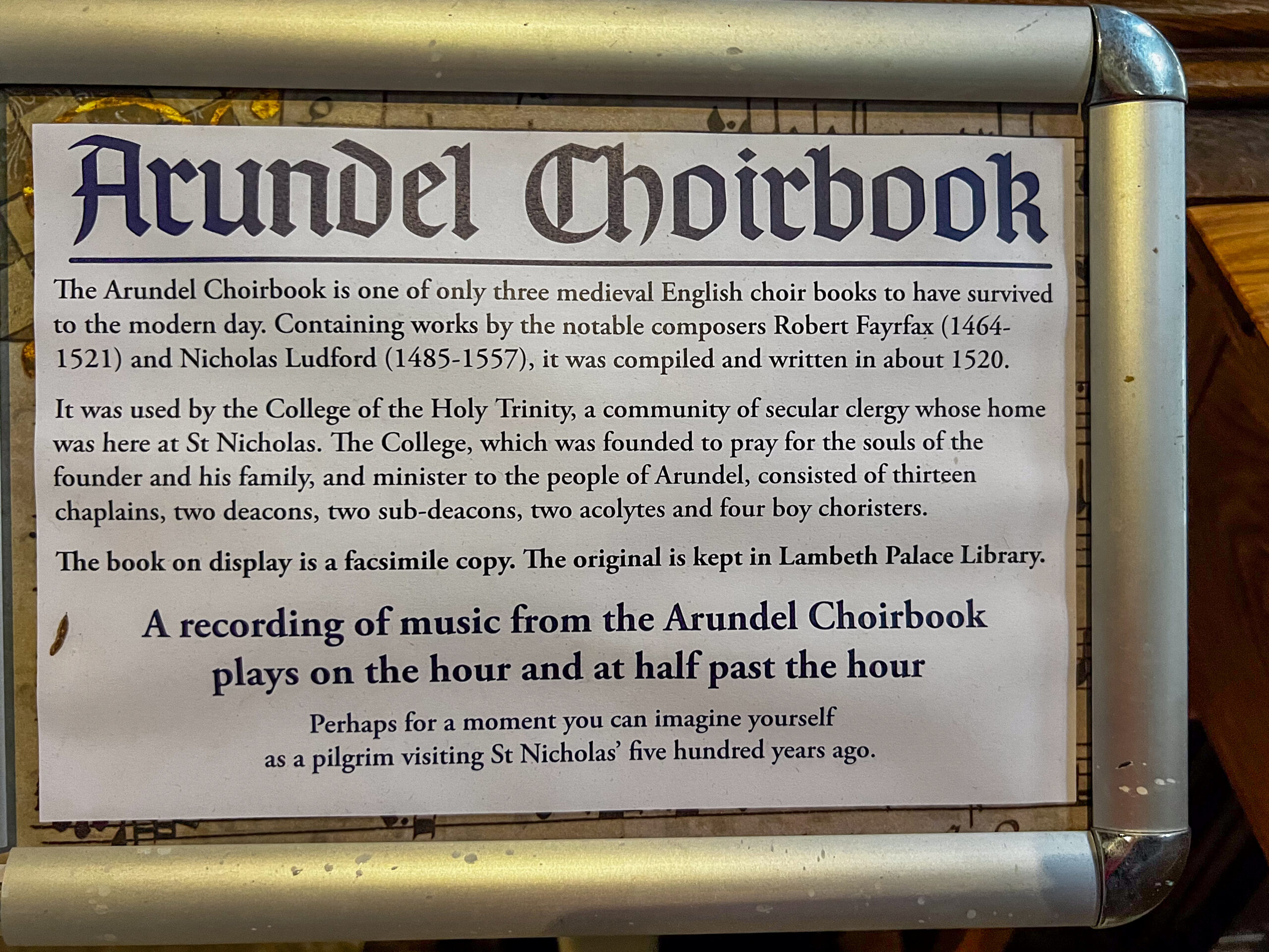 What a treat: a visiting 17-voice choir from London was rehearsing a capella medieval music for a concert that night in the beautiful, ancient church, and they were spectacular. We just sat in a pew and listened, barely breathing. The “Arundel Choirbook” is one of only three medieval English choirbooks to have survived to the modern day. (In the world of choral music it’s a big deal. The original is kept in Lambeth Palace Library.)