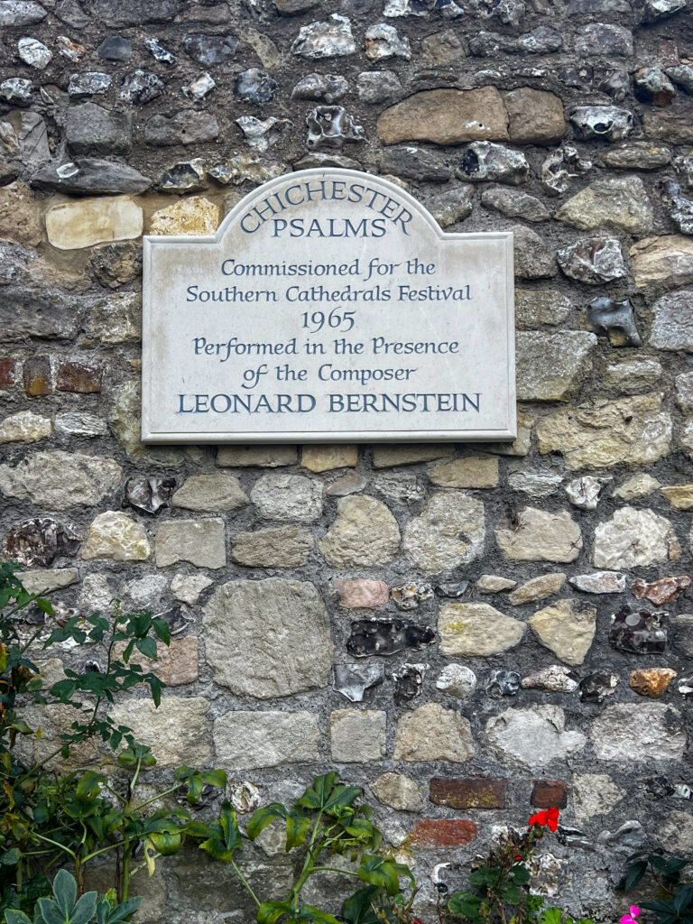 First the composers: Leonard Bernstein wrote the Chichester Psalms, which were commissioned for the 1965 Southern Cathedrals Festival at Chichester Cathedral by the cathedral’s Dean, Walter Hussey. Bernstein is honoured with a plaque on a wall in the garden, outside the front doors of the cathedral. (See photo.)