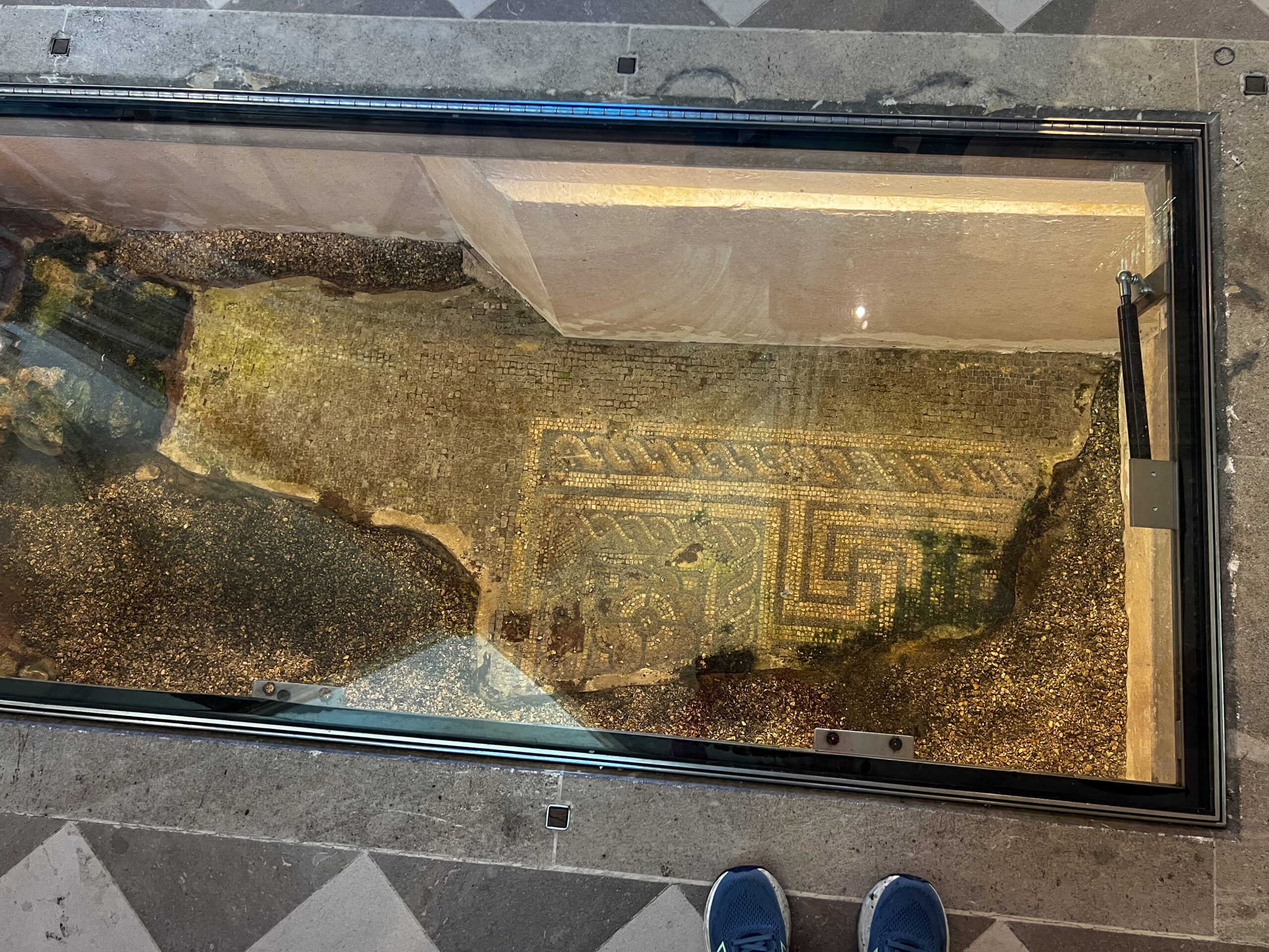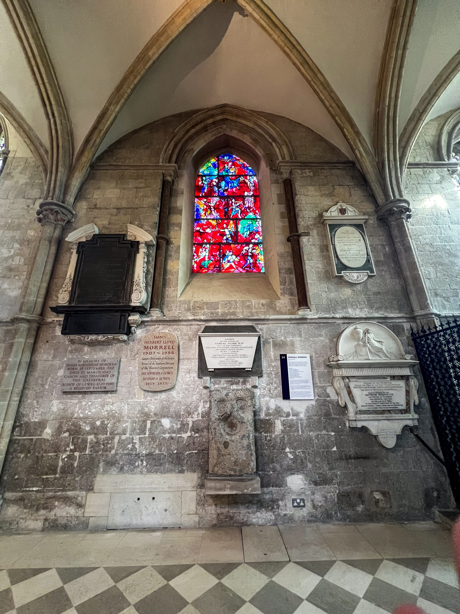 Also worth noting in the cathedral are the Roman mosaic under the floor, only a small portion of which is exposed. “The Romans knew the City of Chichester as Noviomagus Reginorum. This mosaic remnant, which was discovered in 1966, was almost certainly part of the floor of a public building. The remains of six additional rooms from the same period have been identified; these extend out under the south east precinct of the Cathedral.”