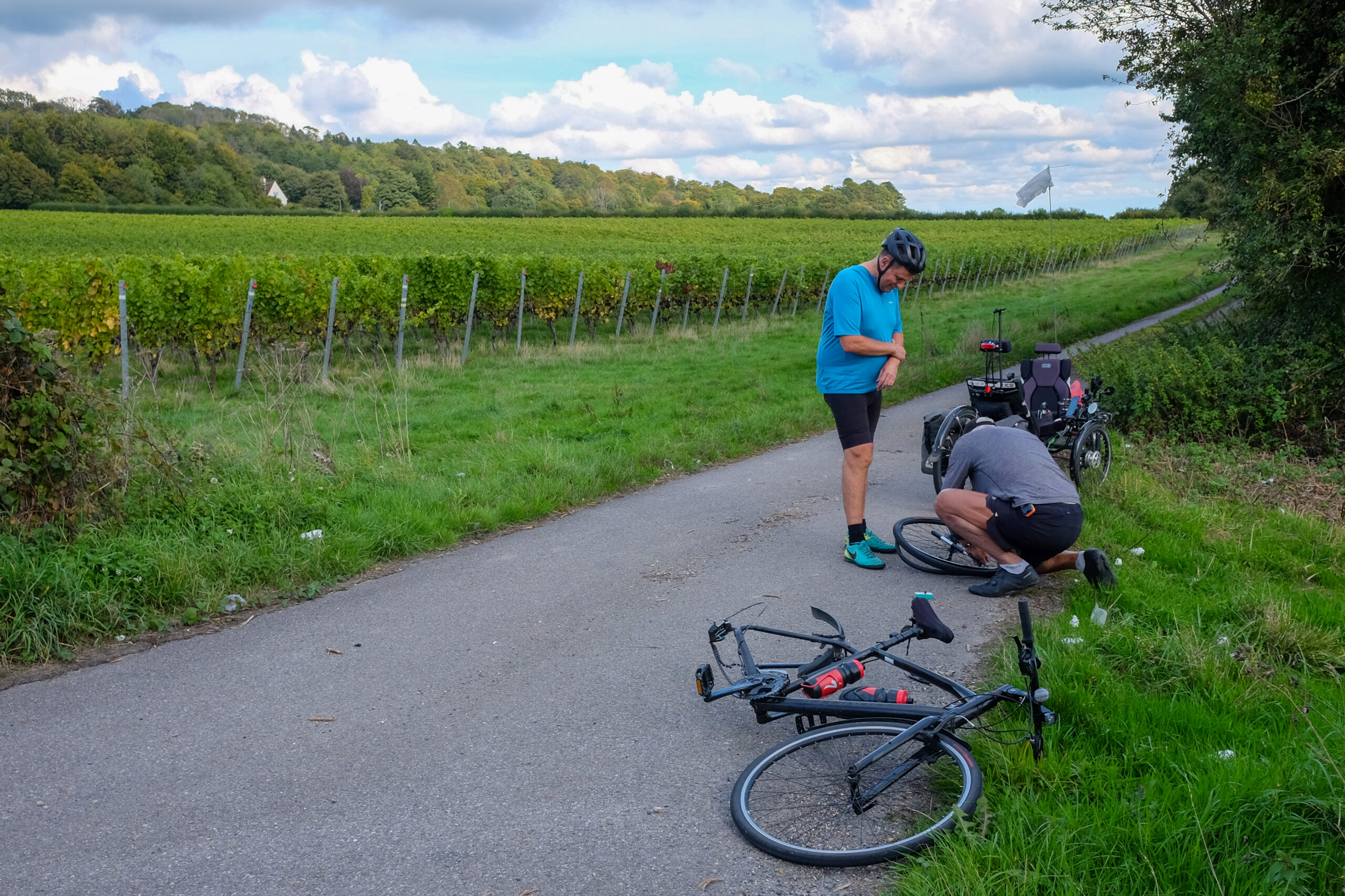 We left Polesden Lacey and continued on with some urgency (we’d spent so long there, we lost track of time!) because the Canadian Women’s Rugby Team were playing England at 3:00 and we had a few miles to put in before we got there. On one busy and hilly road, John saw a cyclist running along, pushing his bike on the narrow shoulder, and shouted at him to follow. We all turned off into a gravel driveway, safely off the road, and John offered to repair the cyclist’s tire.