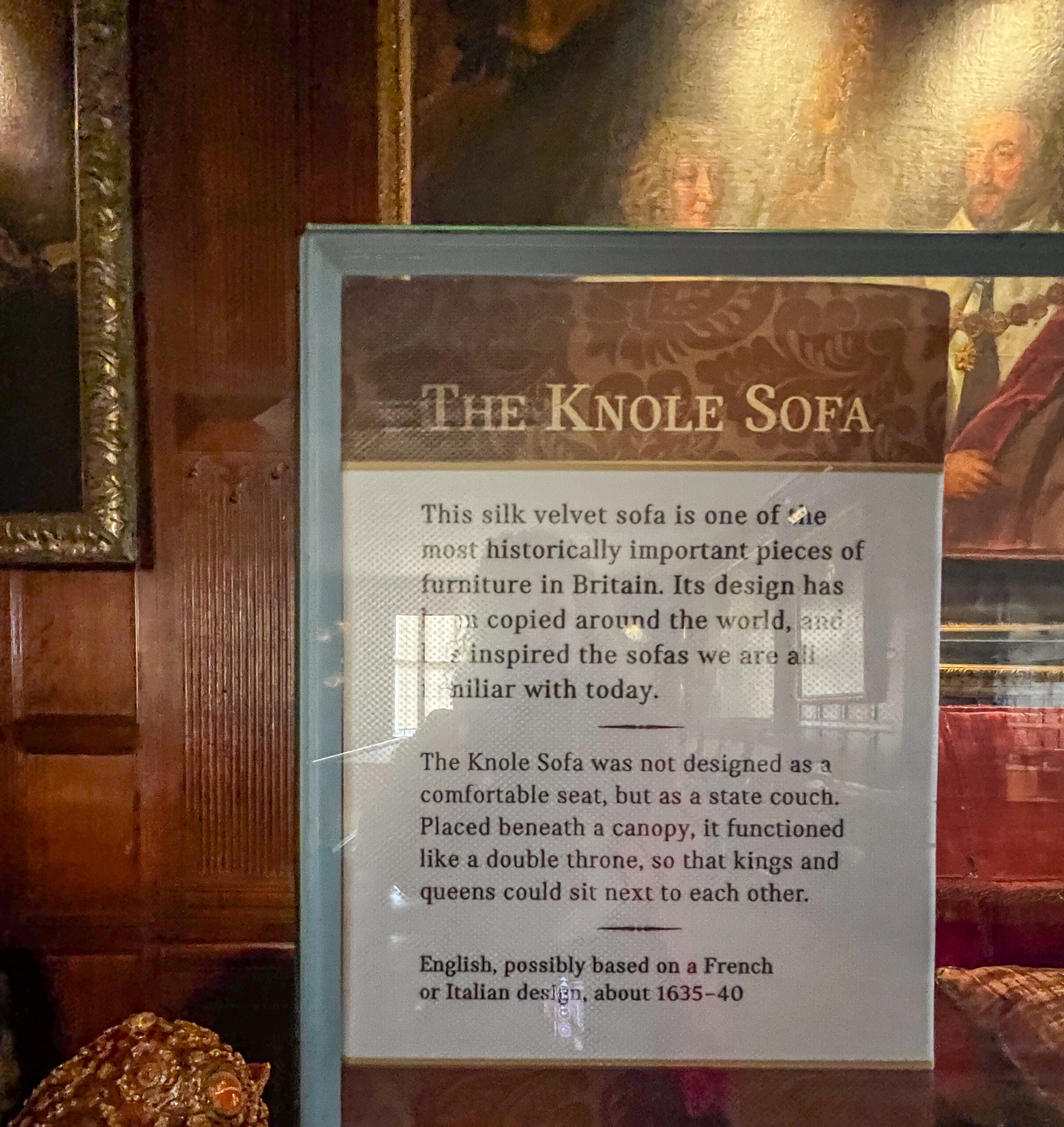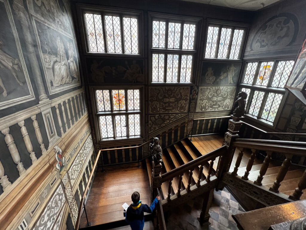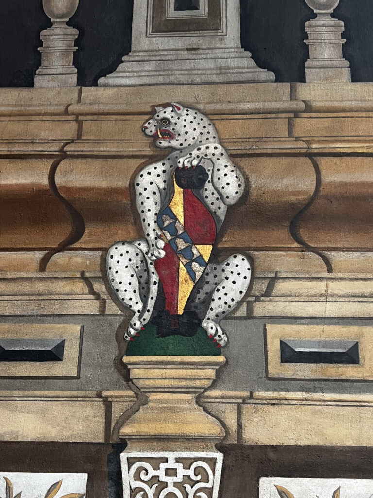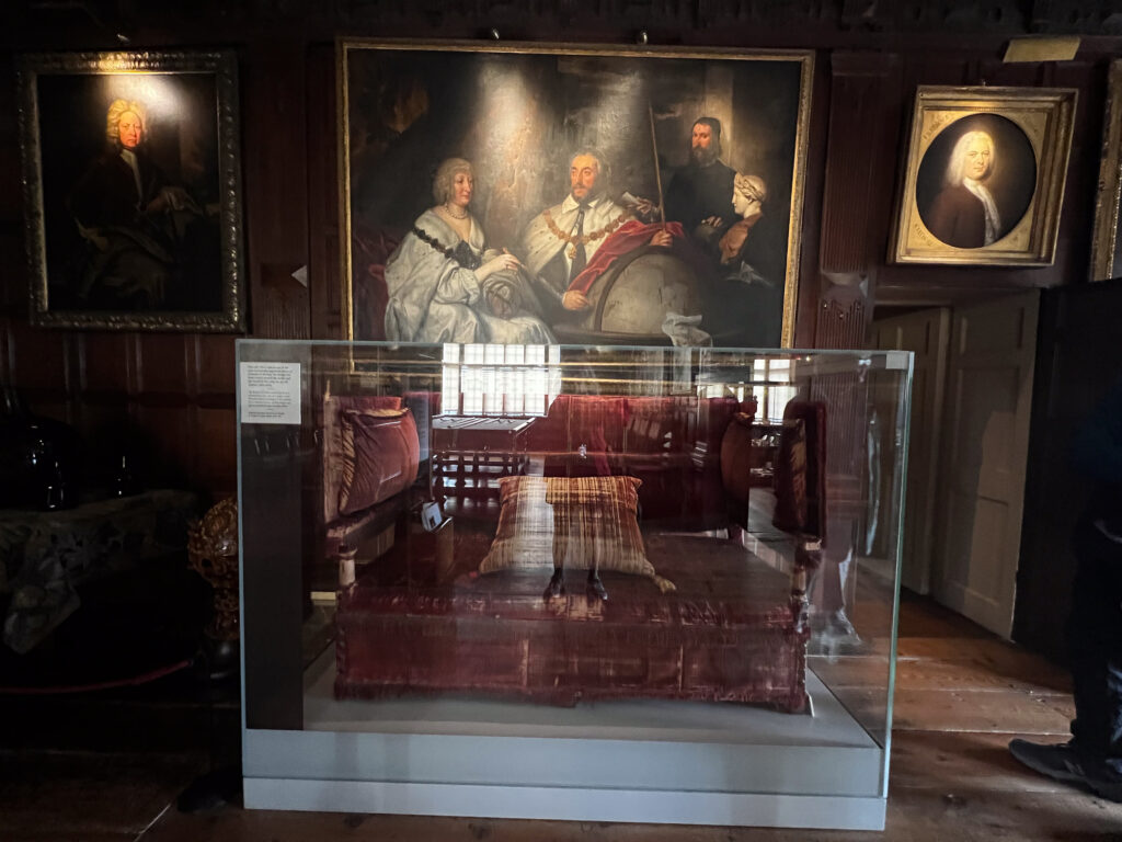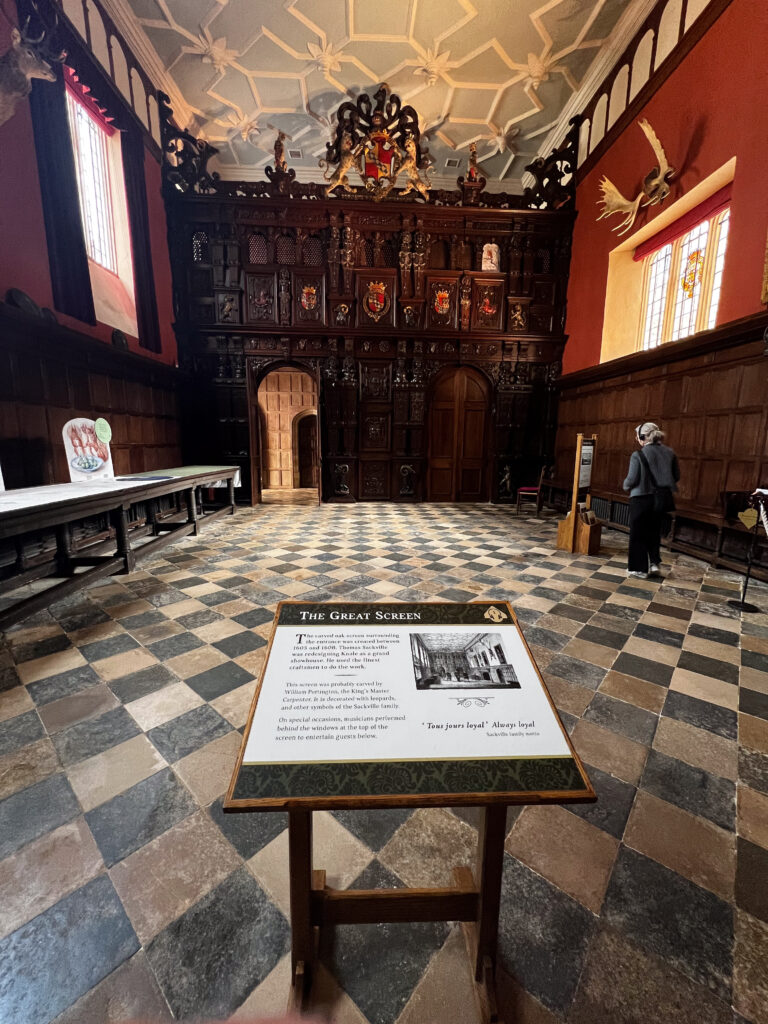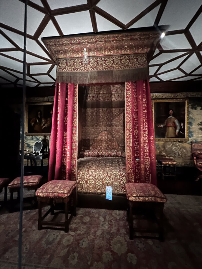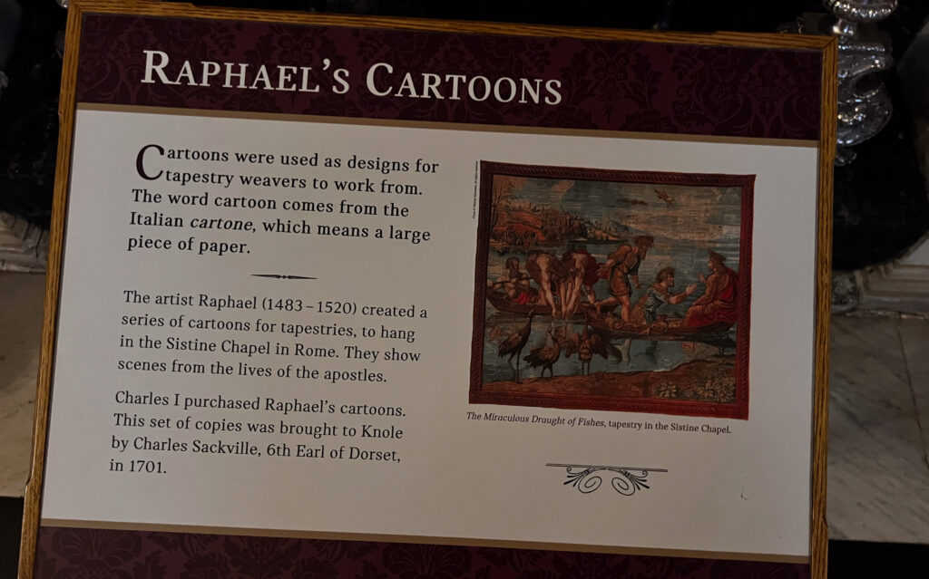 The next day, we were in for a treat at yet another over-the-top National Trust mansion, Knole, southeast of Sevenoaks in west Kent, the childhood home of Vita Sackville-West (we talked about her in a previous blog when we visited her home). Knole is one of the NT estates where it is a very, very good idea to pre-book your ticket. It’s popular not only with tourists, but with locals who love to visit the huge grounds to walk with family and with their dogs. The estate has been in the hands of the Thomas Sackville family since 1605 and there are still Sackvilles living on the estate. You can see where their (private) apartments are in a photo in the gallery, below. There are very tame deer grazing on the grass along the path that leads you into the home. Leopards are a part of the family crest, and you can see leopards in the decor throughout the house. Knole is especially reknowned for the original fabrics on the upholstery, all behind glass, of course, to preserve them. Hanging casually on the walls in one of the galleries are a series of Raphael cartoons, the preliminary sketches for a series of tapestries that would eventually hang in the Sistine Chapel. (!!!) Knole is a truly grand estate, and also highly recommended. See the photos, below.