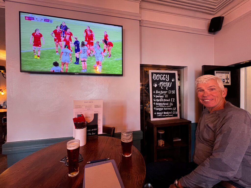 I don’t know what that cyclist would have done if someone hadn’t come along to help: he had no patch kits, and in fact, he knew even less about changing a flat tire than I do, and he was 12 miles – miles – from his home. The sun was beginning to get very low in the sky when we said goodbye to our very grateful new friend, but we managed to find our hotel, check-in, change, and install ourselves in front of a telly in the pub in time to catch the last half of the game. The Canadian women lost that match, but they sure gave every team they played a run for their money. We’re both Canadian Women’s Rugby fans now.