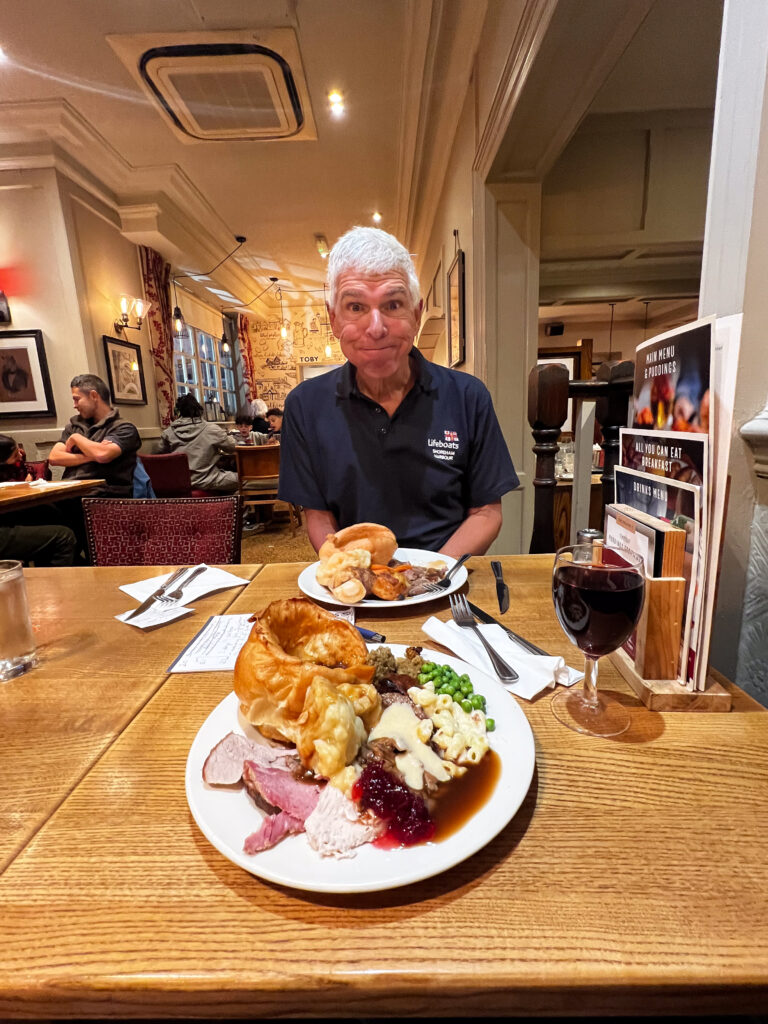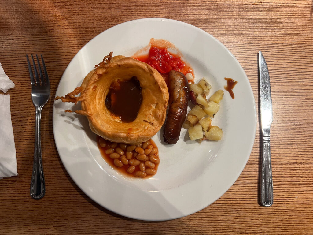 On Sunday we had a short ride planned (43km) to Eden Park. Ironically, in our original route we had planned to visit The Eden Project in Cornwall on this day. (Check it out.) Our hotel for this evening was a room in The Toby Carvery. The Toby Carvery is a popular, medium-priced chain of restaurants that specialize in “carvery“: turkey, gammon, ham and beef roasts, all served with absolutely enormous Yorkshire puddings, and all of the trimmings and “Brown Sauce” you can imagine, at a buffet. Being Sunday afternoon, they were doing a brisk business. I don’t need to visit another Toby Carvery ever again but it was good food, reasonably priced, and a real eye opener to see the Brits get their carvery on… And I had Yorkshire with beans and sausage for breakfast.