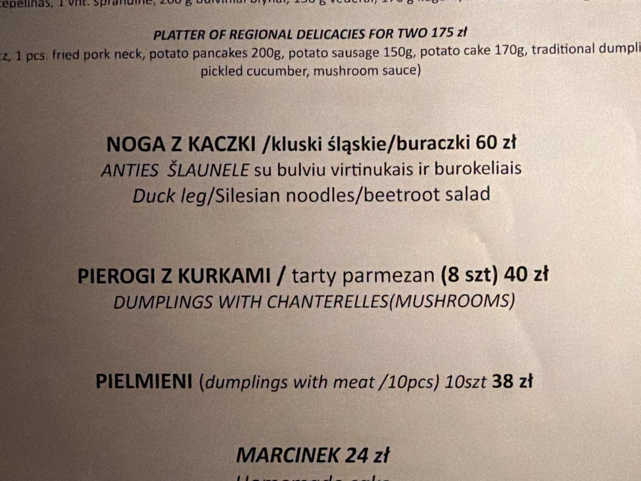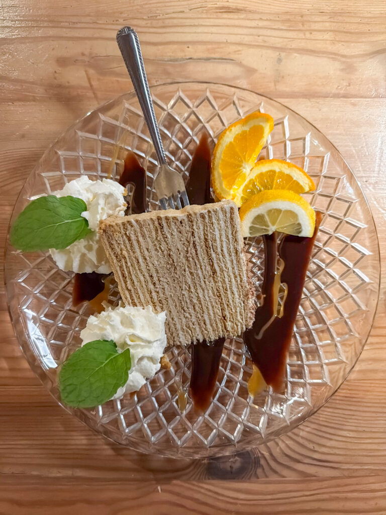 The hotel receptionist recommended a restaurant around the corner for authentic northern Poland fare. Well – not disappointed to say the least. The herring was extraordinary – certainly not the blocks of fish dug out of jars we are used to. So tender and subtle. And the pierogies, stuffed with mushrooms. Wow! Not doughy or sticky. And a twenty layer piece of cake, with whipped sour cream and berries. Unbelievable.