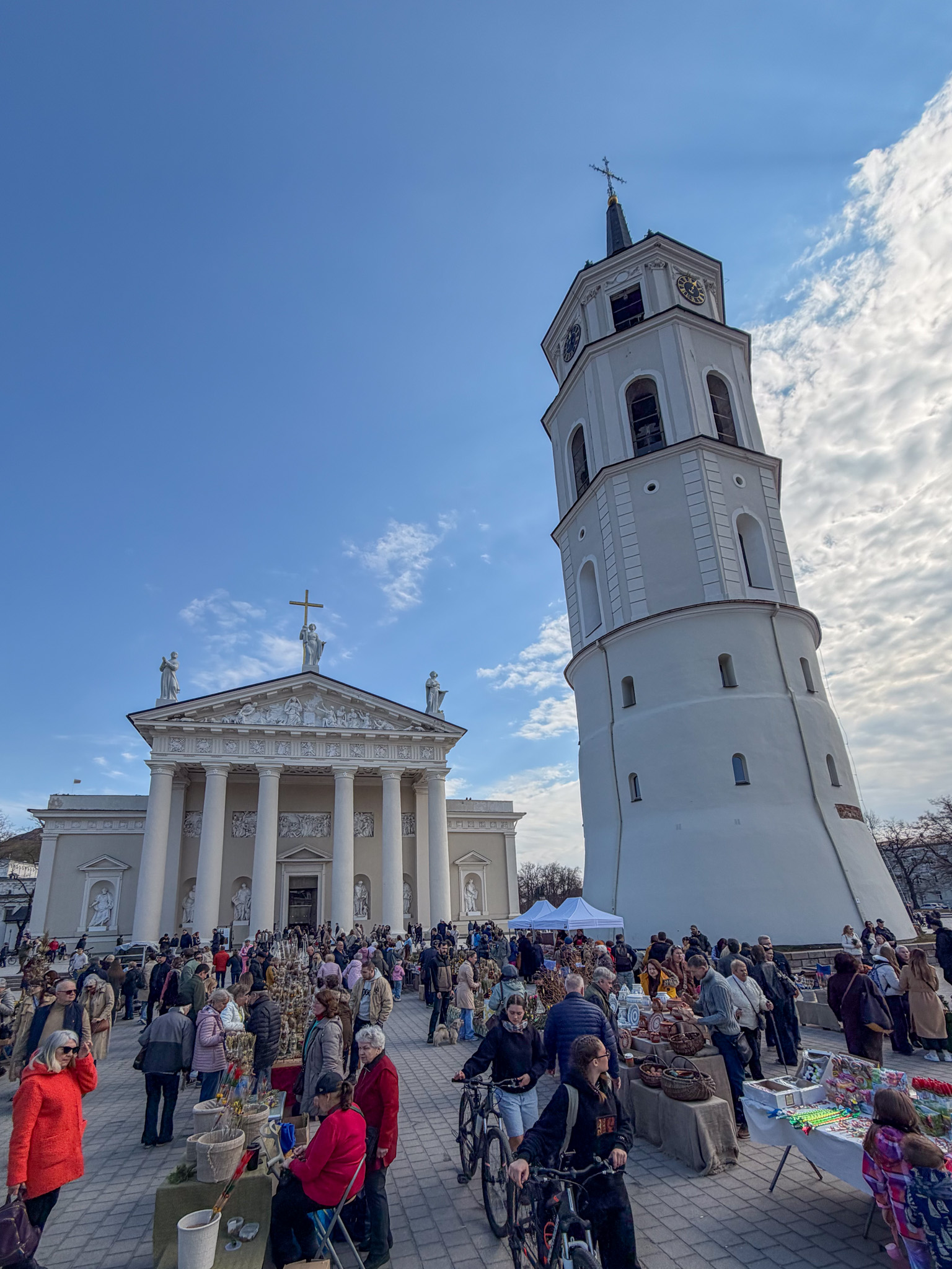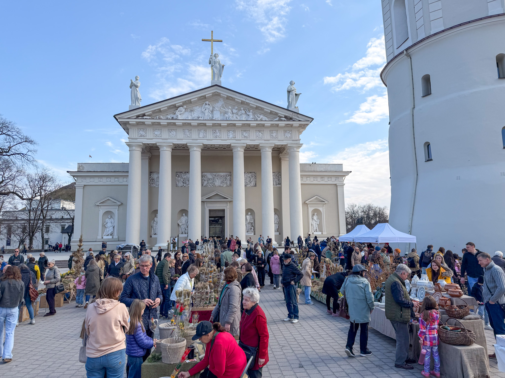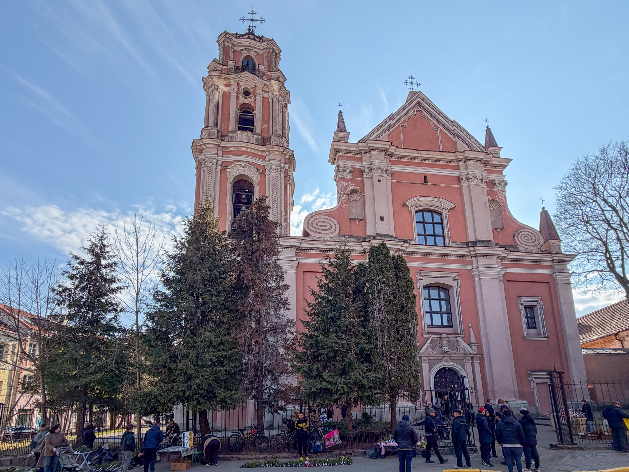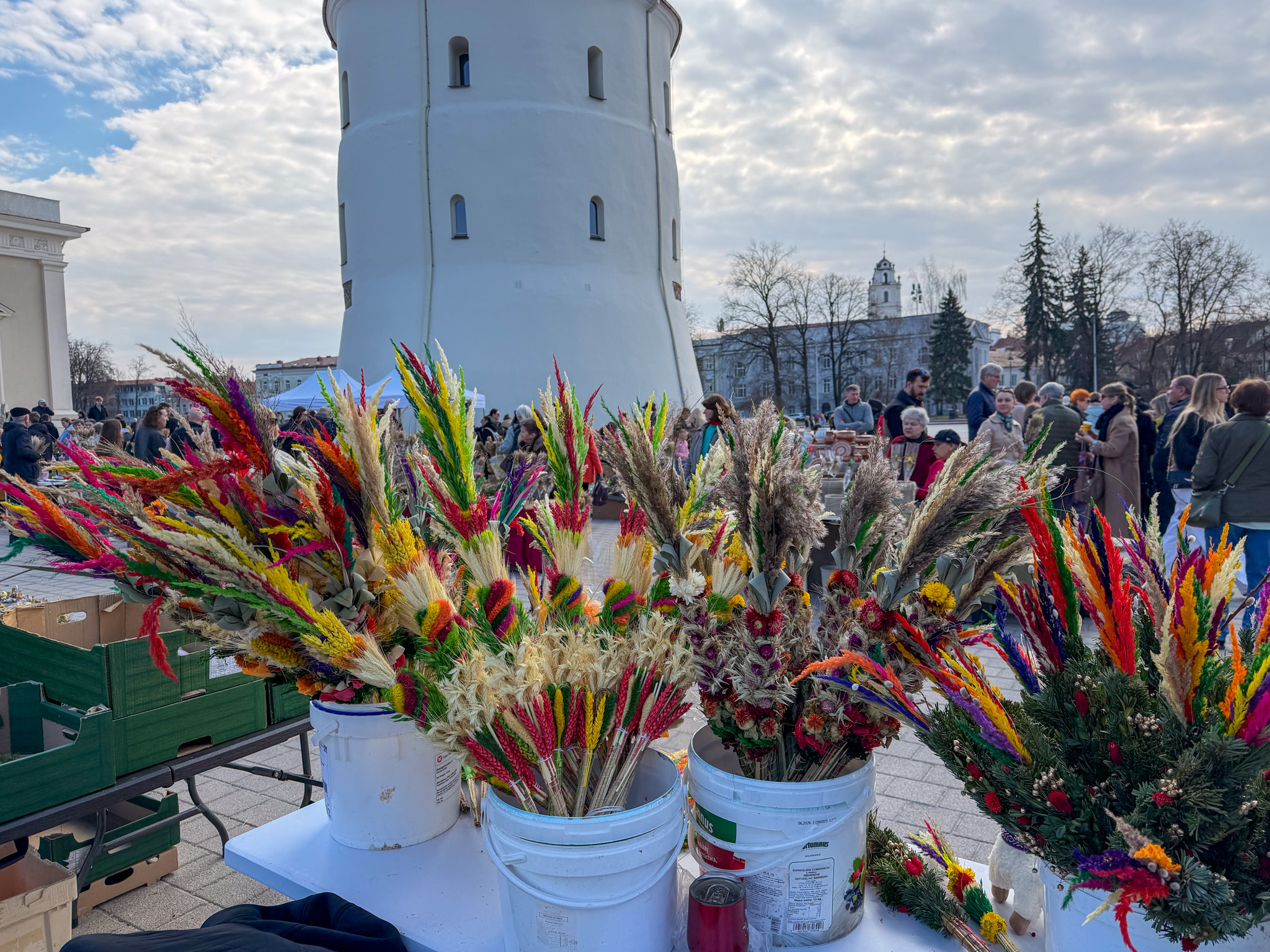 Our first impression of Vilnius is CHURCHES. They are everywhere, and we were lucky to be walking around the old town on Palm Sunday, the Sunday before Easter. The churches and streets were full, and people carried the local version of a palm – a pine frond. Street vendors were selling brightly coloured fronds everywhere. Every turn of a corner in Vilnius reveals another large impressive church face. Most of the old town is car-free, so walking is a very pleasant, quiet and safe activity.