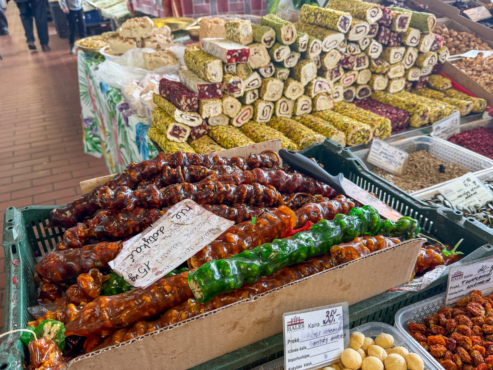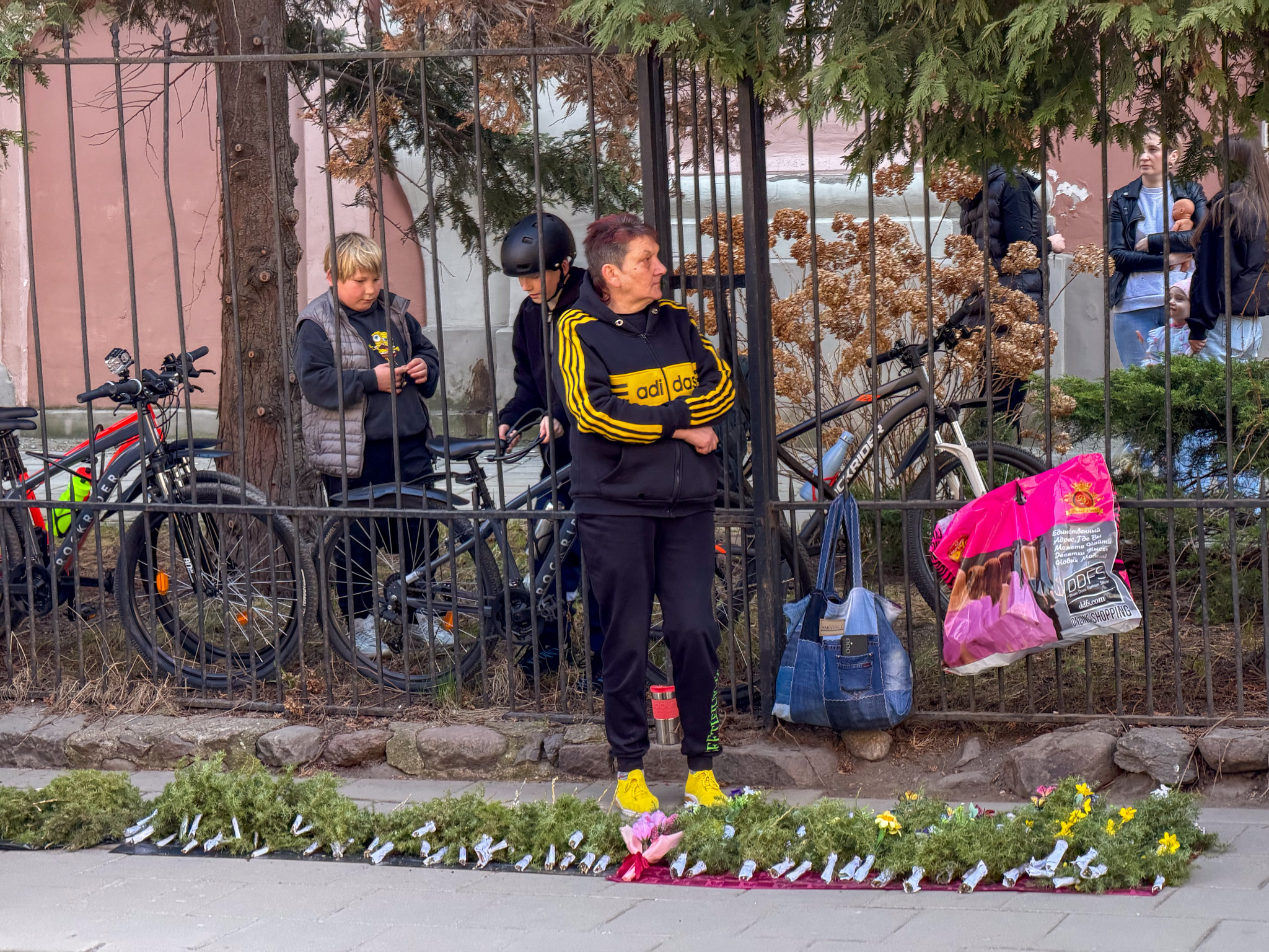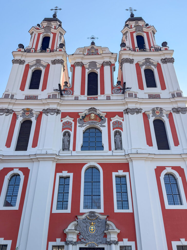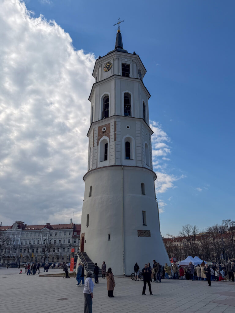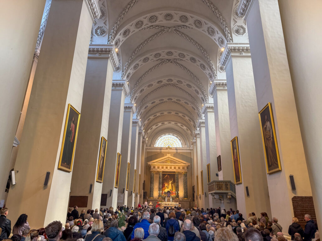 Our first impression of Vilnius is CHURCHES. They are everywhere, and we were lucky to be walking around the old town on Palm Sunday, the Sunday before Easter. The churches and streets were full, and people carried the local version of a palm – a pine frond. Street vendors were selling brightly coloured fronds everywhere. Every turn of a corner in Vilnius reveals another large impressive church face. Most of the old town is car-free, so walking is a very pleasant, quiet and safe activity.