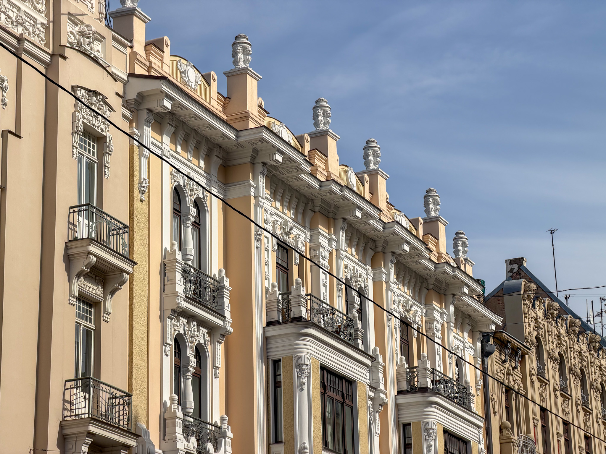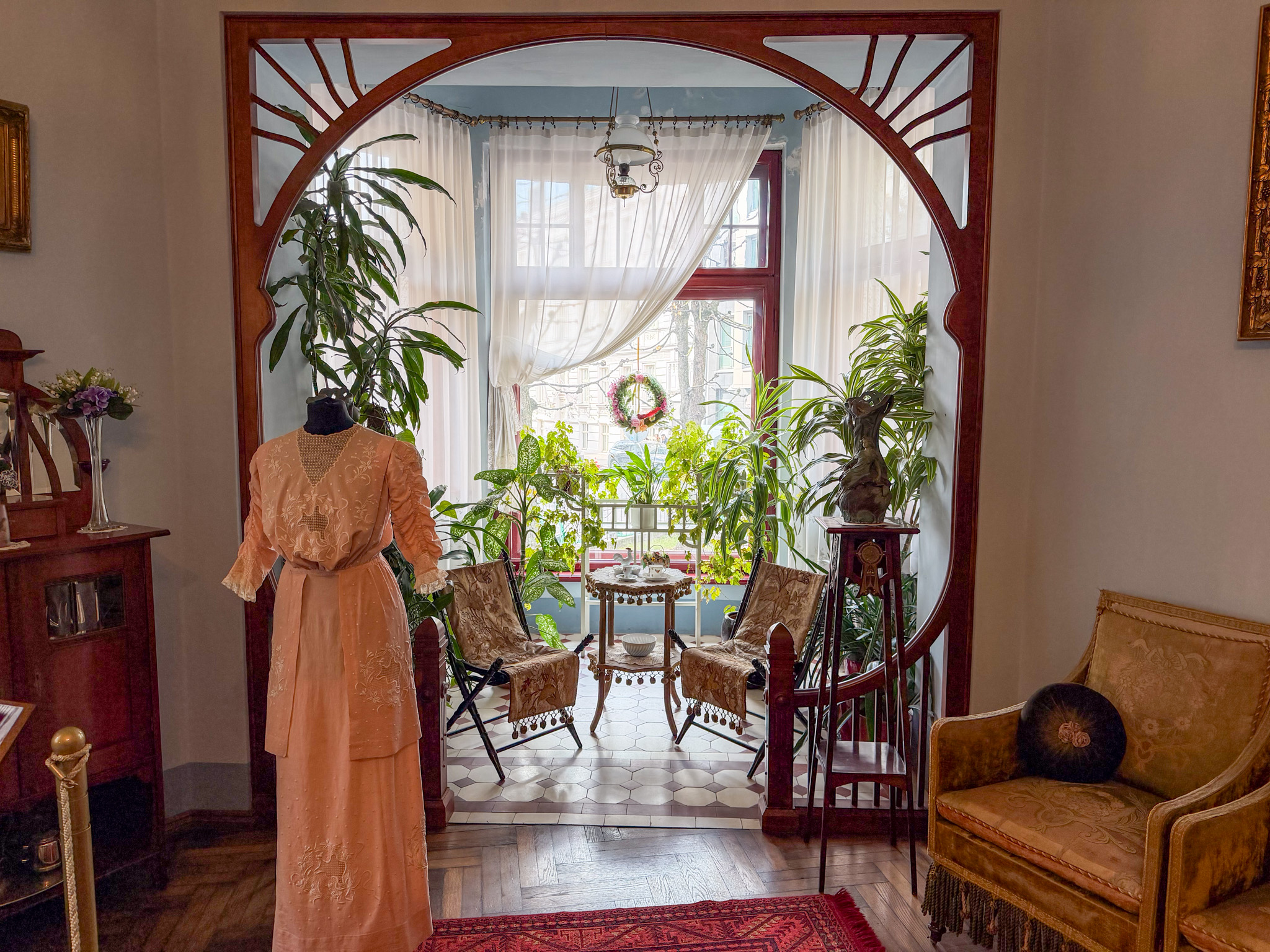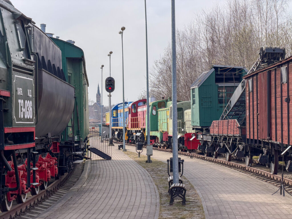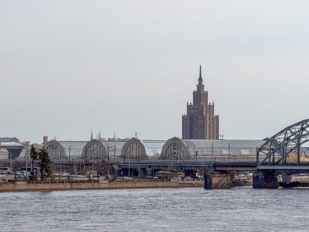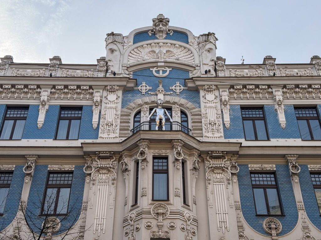 Next morning we froze as we walked to the market to find breakfast. The market is housed in five repurposed zeppelin hangers not far from the station. We were a bit early – most of the stalls were still setting up. We grabbed a coffee, then set out across the wide Daugava River bridge to the Railway Museum. We enjoyed the indoor displays, model railroad, and outdoor collection trains. Then – begrudgingly – we trudged, coldly, back across the bridge to find the Art Nouveau.