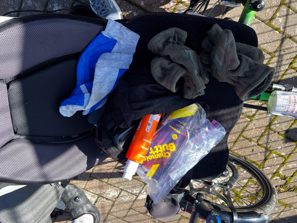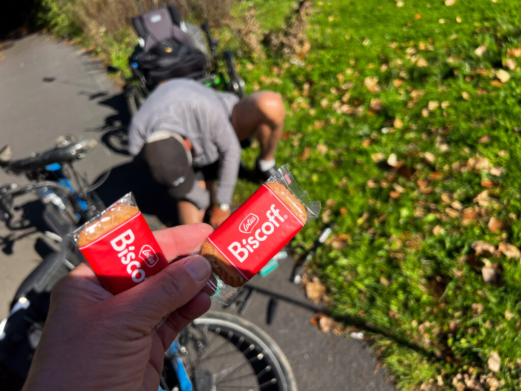 It was a relief to finally turn off the highway onto the next segment of our ride which would turn out to be a repurposed railbed through parkland (and, tantalizingly, past the massive Marks and Spencer distribution warehouse). It was there that I discovered that I now had not just one but two shitty punctures. Luckily, (i) the bike mechanic I travel with wasn’t too far ahead of me, and (ii) we still had puncture kits and (iii) hotel-room cookies to make the repair in the (iv) sunshine. So often, punctures happen on rainy days or bitterly cold ones! The upside/downside outcome of that episode was that, too late, John realized the sense of smell that he thought had been wiped out by Covid was actually still functioning and there was a steaming pile of dog-do right beside where he had started the repair. (Queue the moans…)