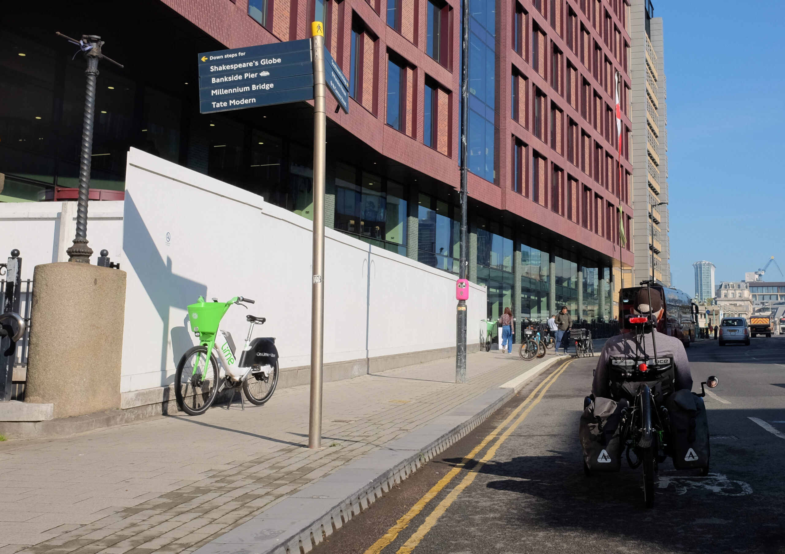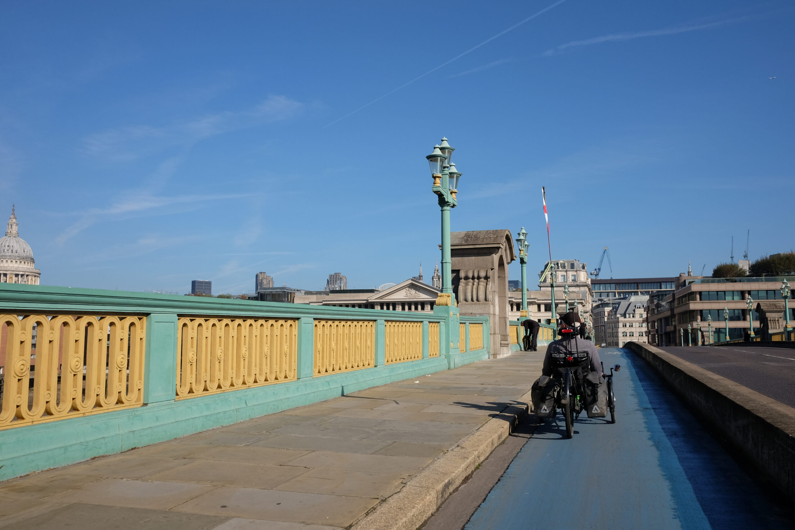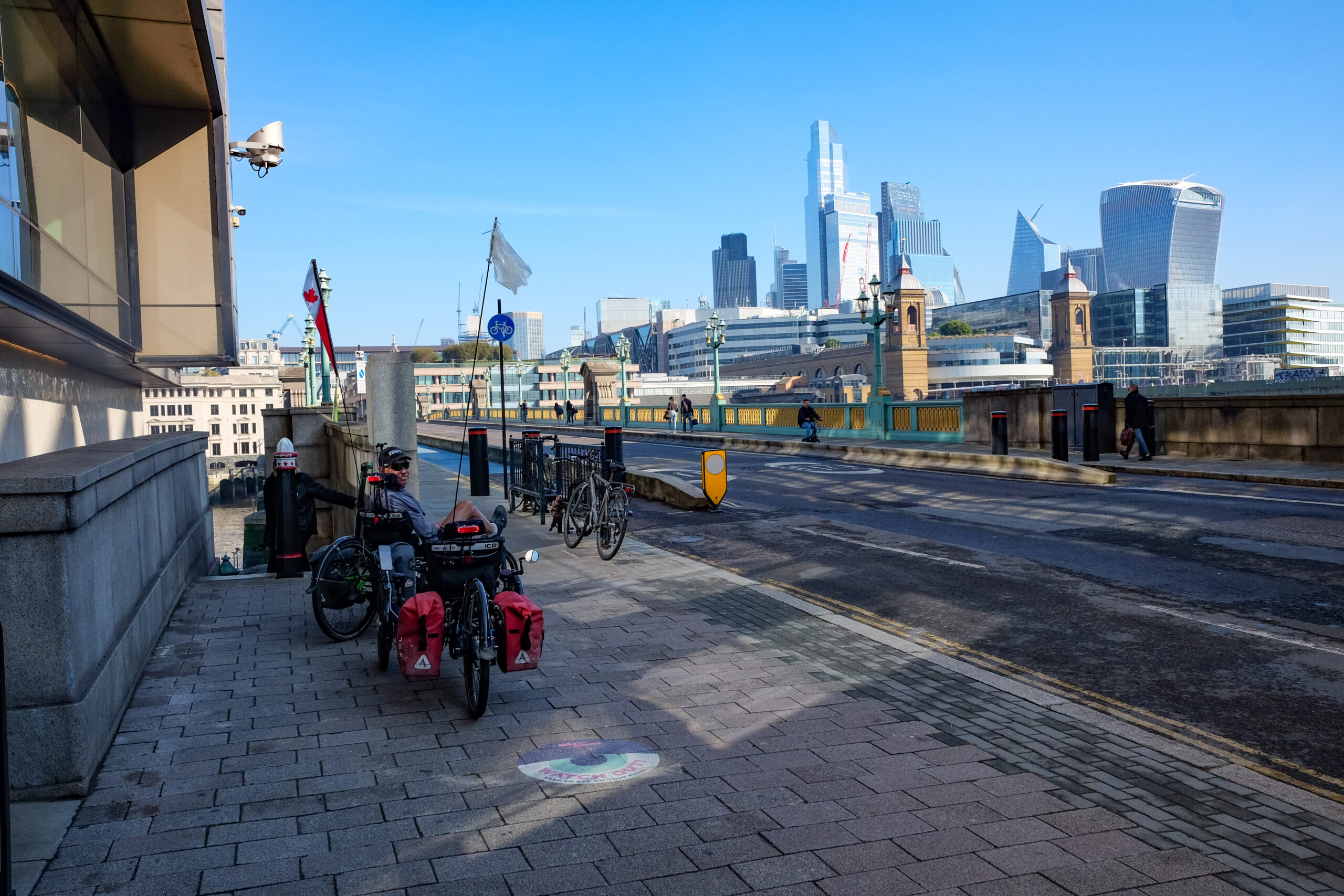 When we left The Carvery in Eden Park (fuelled by a ridiculous number of Yorkshire Puddings) it was chilly, and I (Patti) wore mittens for the first half of the ride. We stopped at a hilltop park just south of London and were excited when we could see its tall buildings in the mist in the distance, and then, as we rode on further, more and more signs for familiar landmarks. We crossed onto the north side of the Thames on the Southwark Bridge, smiling the sight of St. Paul’s on our left.