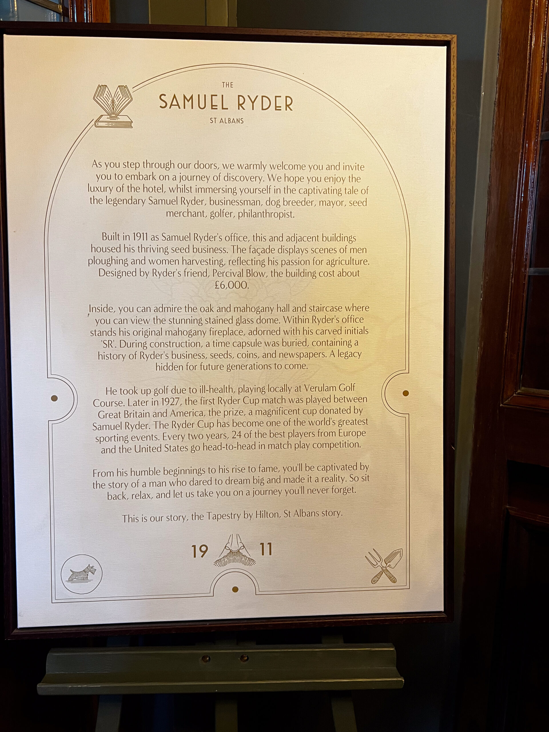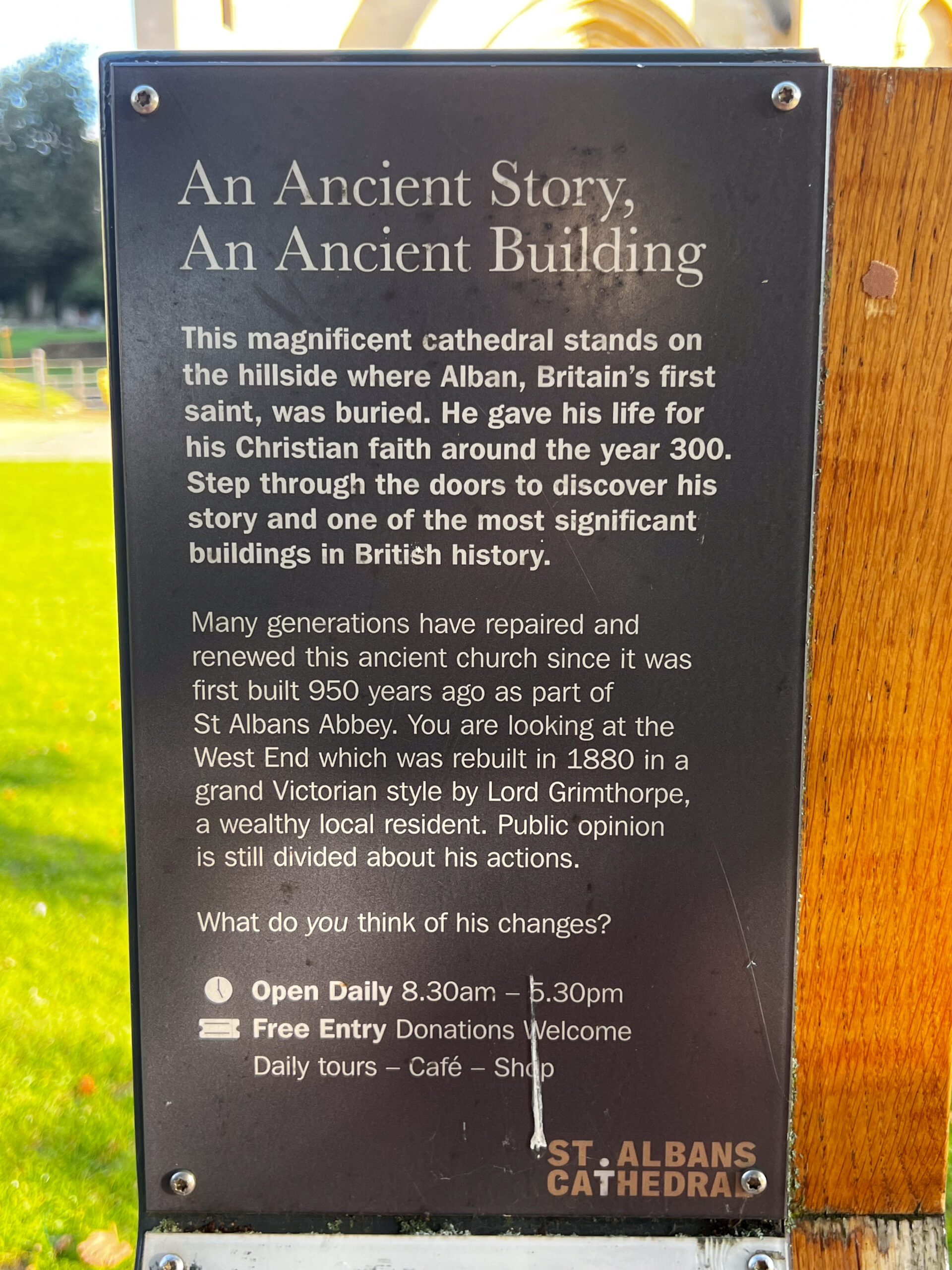 Travellers’ tip: the Premier Inn isn’t premier. I’m hoping when we return in the Spring that we stay at the Samuel Ryder Hotel. (It’s in the former home of golf legend, Samuel Ryder. Coincidentally, right before we were in St. Albans the Ryder Cup had been played in the US, and the unsporting behaviour of American fans had appalled golf fans around the world. Apparently it was epic. I blame Trump. There, I said it.)