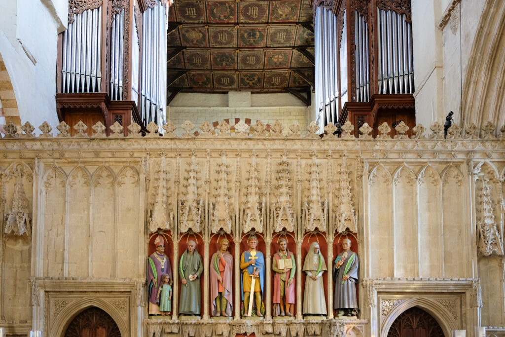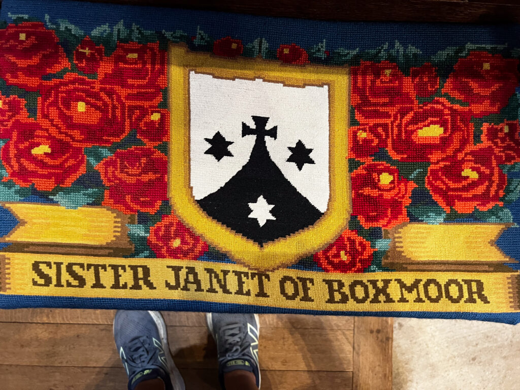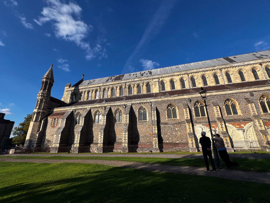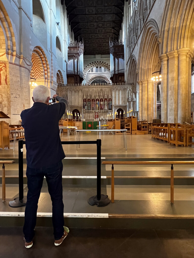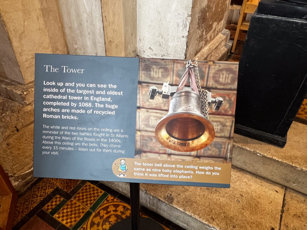 St. Albans is a nice city. Very walkable, and it has an ancient cathedral (most of its architecture dates from Norman times, 11th century) where we, of course, planned to see Evensong at 5:30 (bringing our Evensong tally for the entire trip to five.)  It is not the oldest cathedral in England but it is the oldest site of continuous Christian worship in Britain. While their boys’ choir rehearsed – 20 young, sublime voices led by an exacting but encouraging conductor – we walked around the cathedral, down the longest nave in the UK – 85 metres – admiring the Roman bricks in the arches, the painted ceiling in the tower, and the embroideries (needlepoint cushions and kneelers). Photos, below. We sat in the quire for Evensong, and it was thrilling.