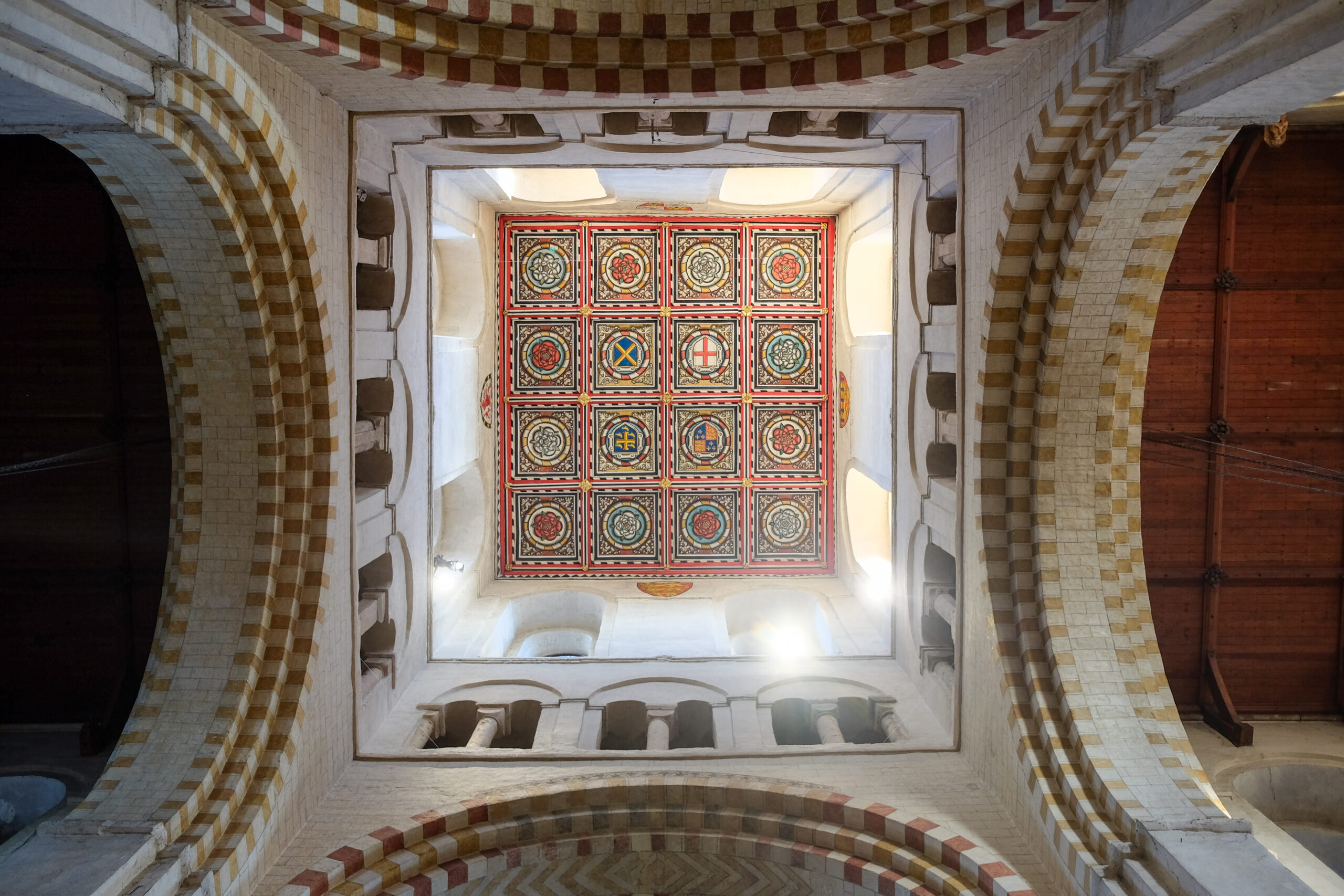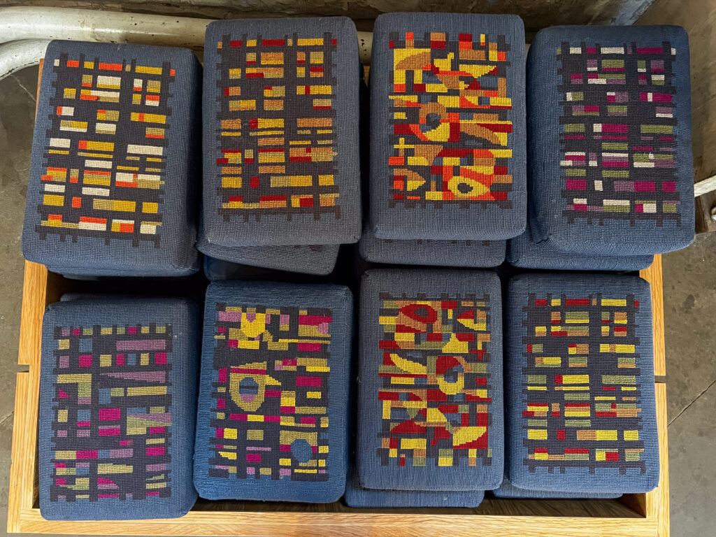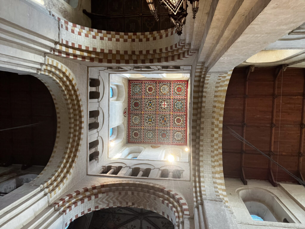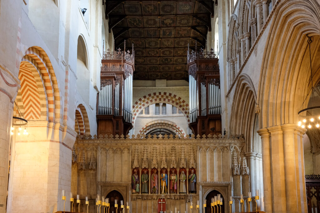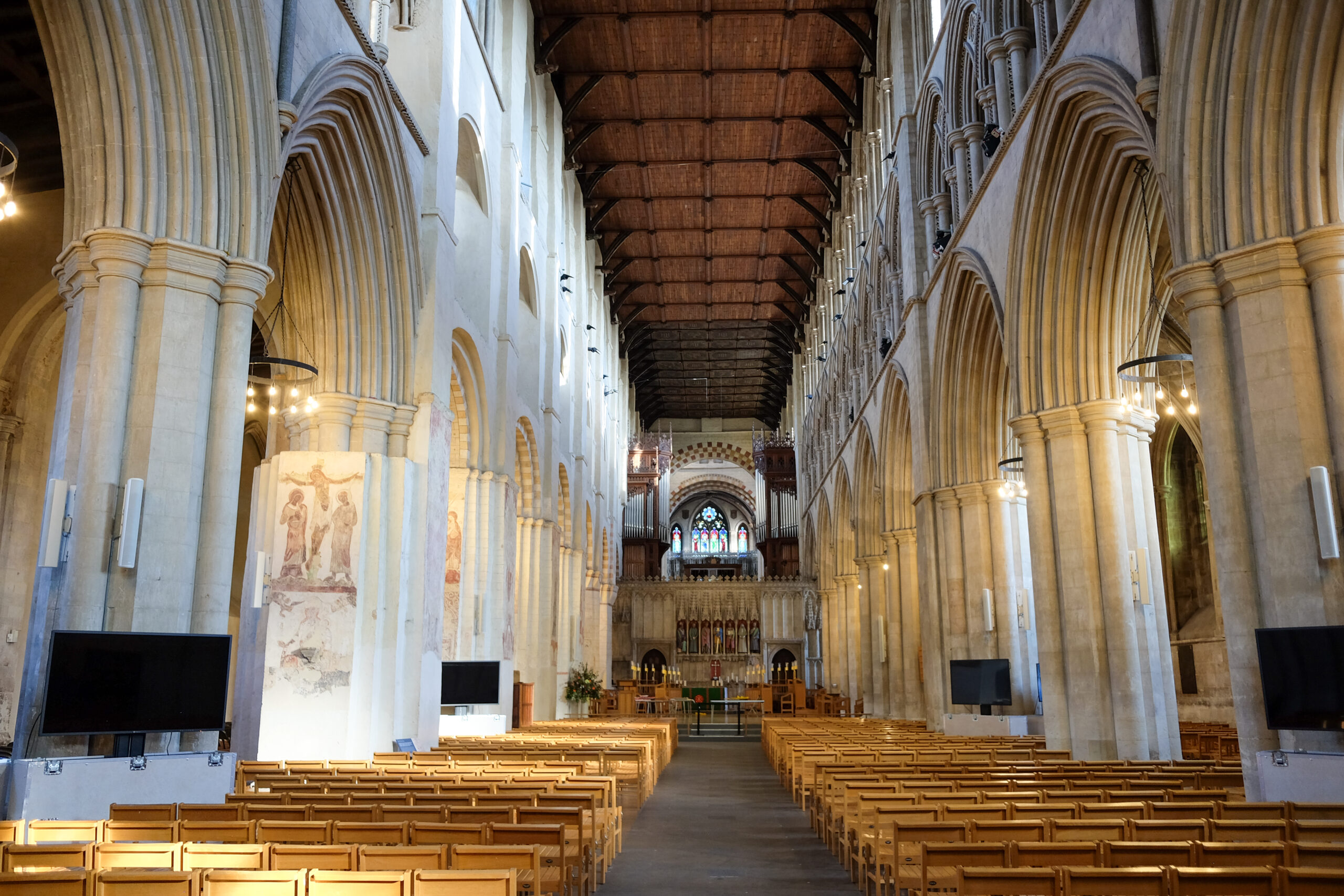 St. Albans is a nice city. Very walkable, and it has an ancient cathedral (most of its architecture dates from Norman times, 11th century) where we, of course, planned to see Evensong at 5:30 (bringing our Evensong tally for the entire trip to five.)  It is not the oldest cathedral in England but it is the oldest site of continuous Christian worship in Britain. While their boys’ choir rehearsed – 20 young, sublime voices led by an exacting but encouraging conductor – we walked around the cathedral, down the longest nave in the UK – 85 metres – admiring the Roman bricks in the arches, the painted ceiling in the tower, and the embroideries (needlepoint cushions and kneelers). Photos, below. We sat in the quire for Evensong, and it was thrilling.