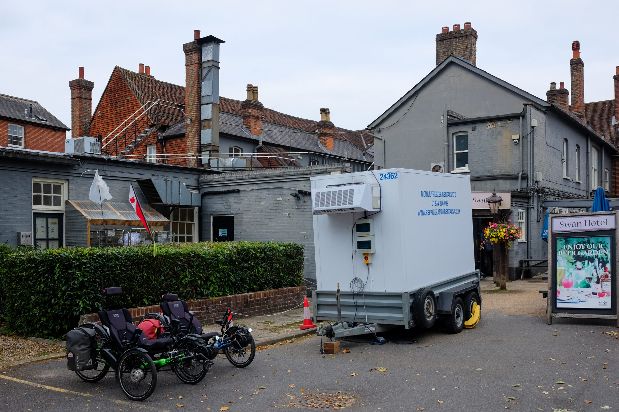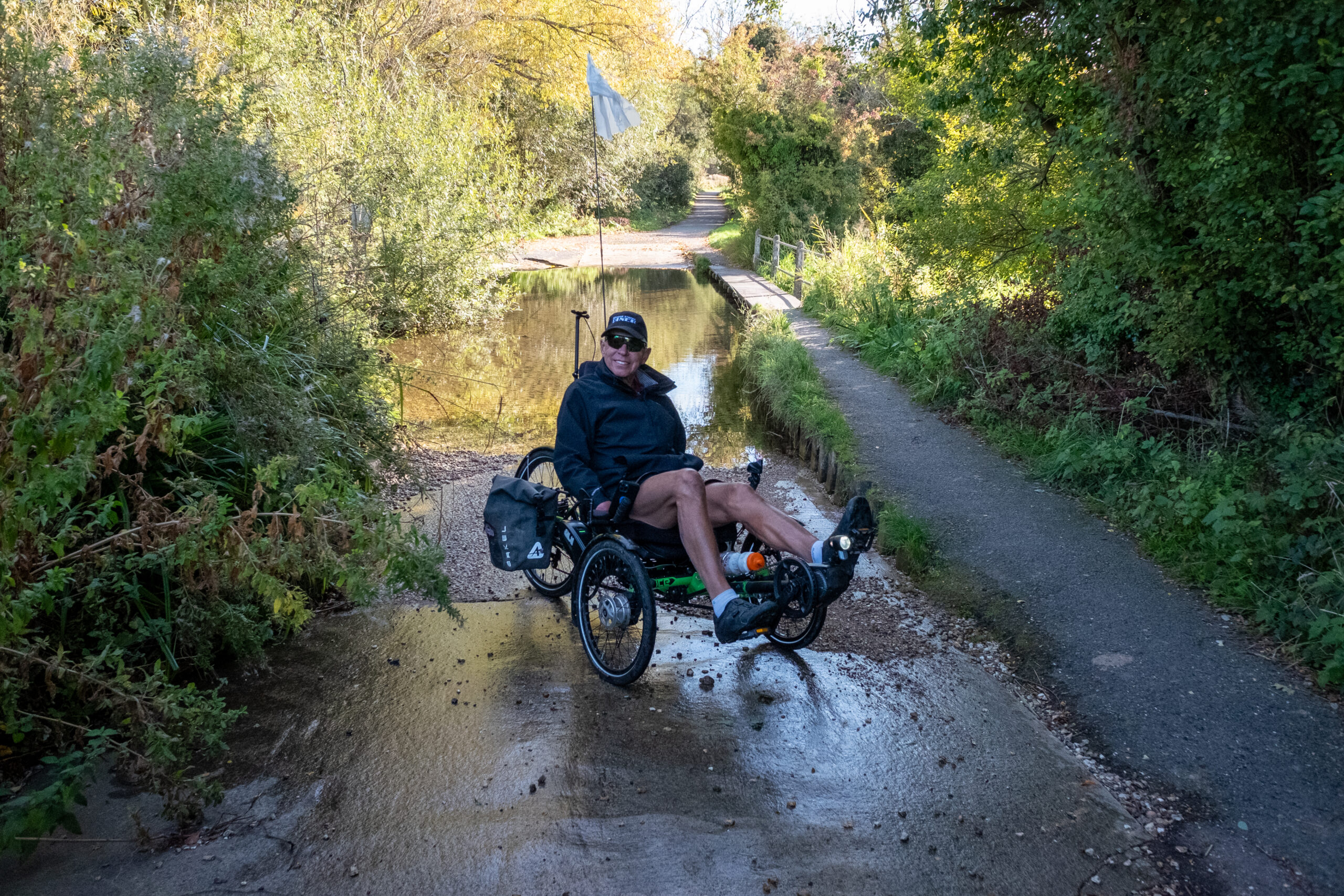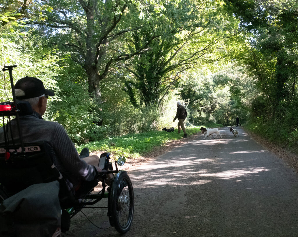 Thursday morning, the 24th, we pushed on to our next new destination, “Alton”, which Patti was delighted to learn was where Jane Austen lived with her beloved sister Cassandra, and from where she wrote six of her novels. We had great weather again! but the route was very wet. At one point we came to an impassable shallow creek (10″ that would have put our bottoms in the drink, and the bike path was too narrow for the wide front wheelbases of our trikes, so we did a re-route adding only a few kilometres to the route).
