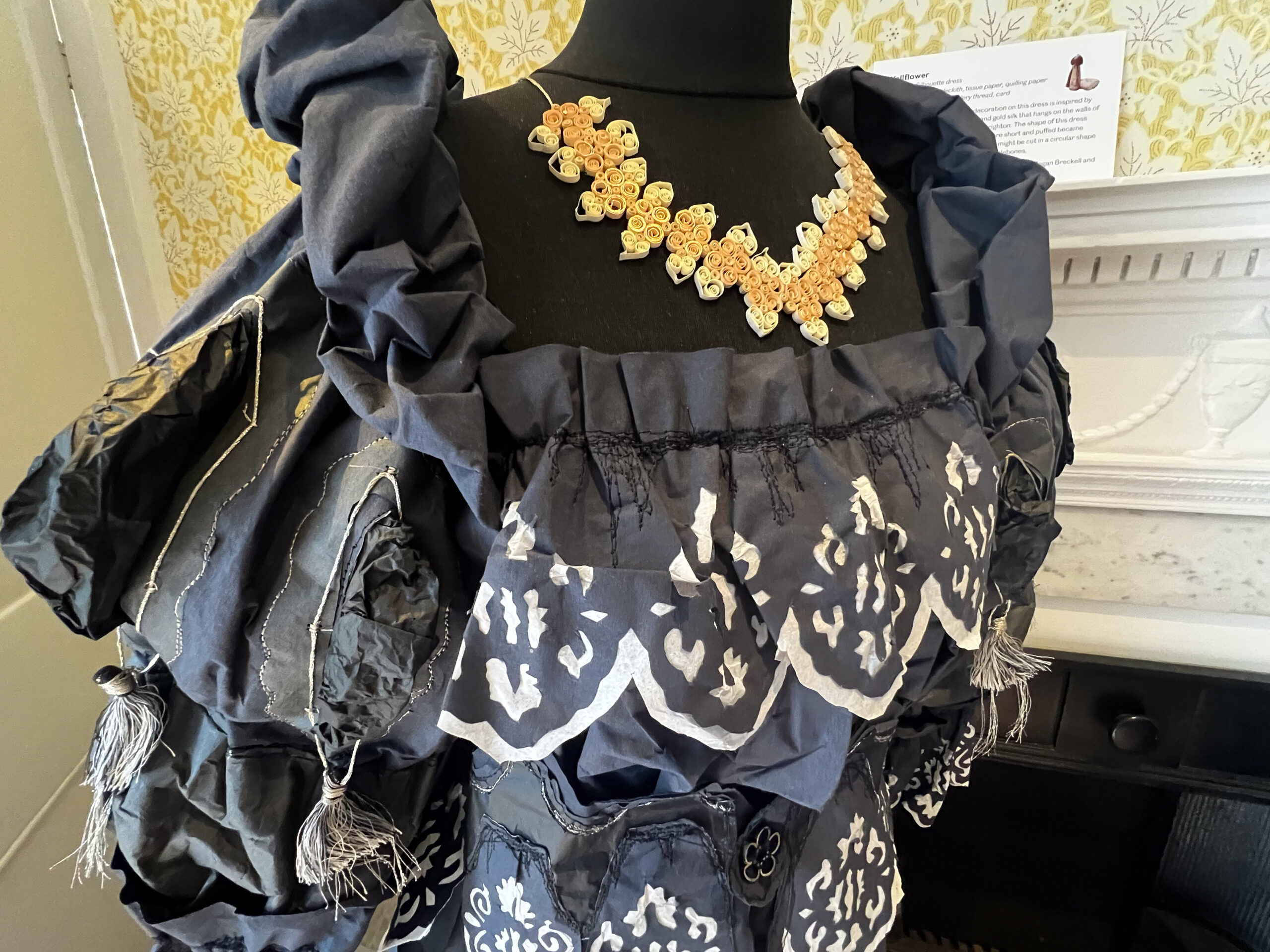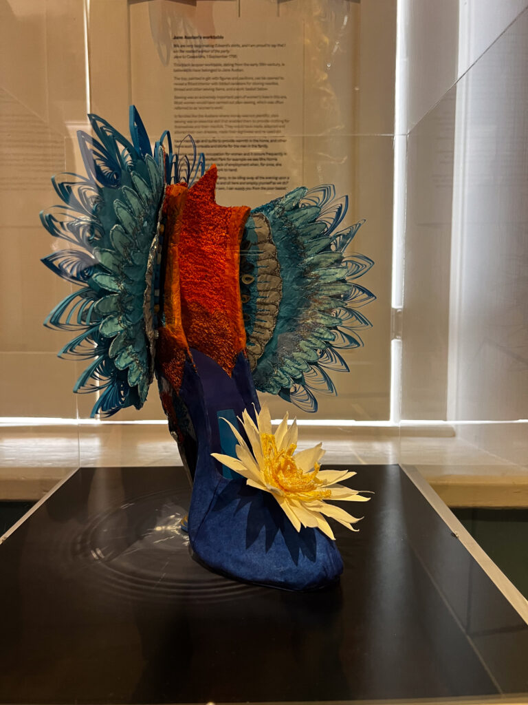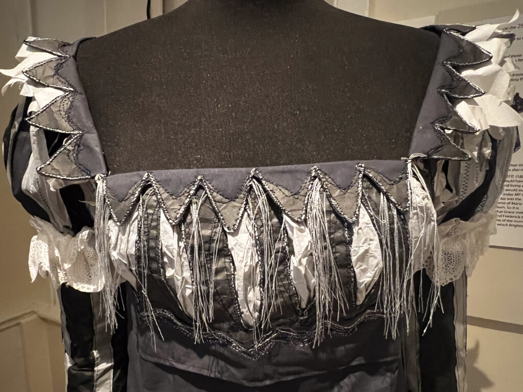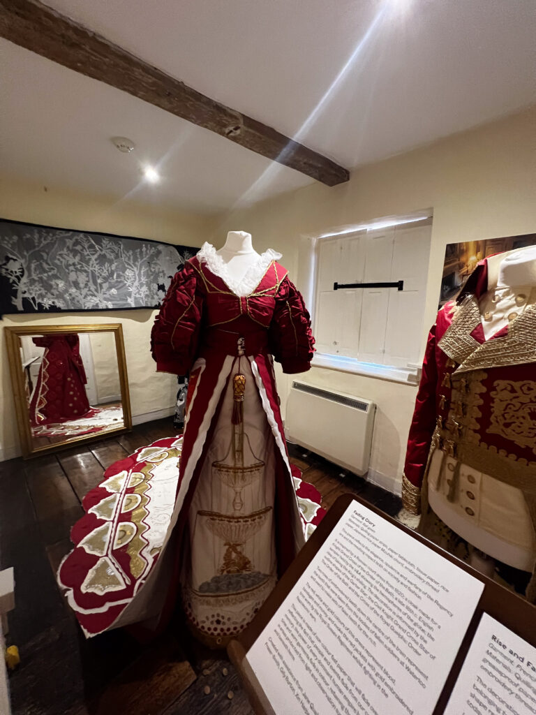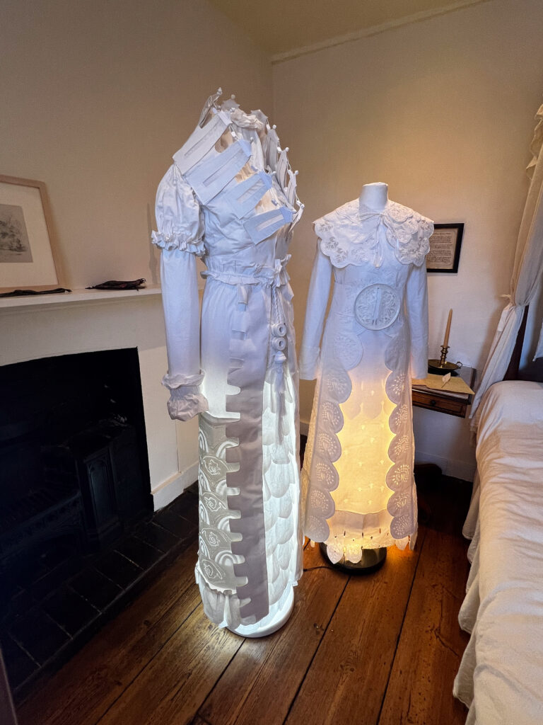 We found our pub/inn for the night, parked the bikes, dumped the panniers and walked up the main street about 25 minutes for a timed-visit to Jane Austen’s house. Timed only because in the house, the rooms are very small, and the staff are very respectful of visitors’ need for time and space to absorb what is basically a carefully and lovingly tended shrine for Austen fans. It was a really enjoyable visit, made even more so by the work of a paper artist who had recreated Regency costumes, life-sized, of incredible detail.