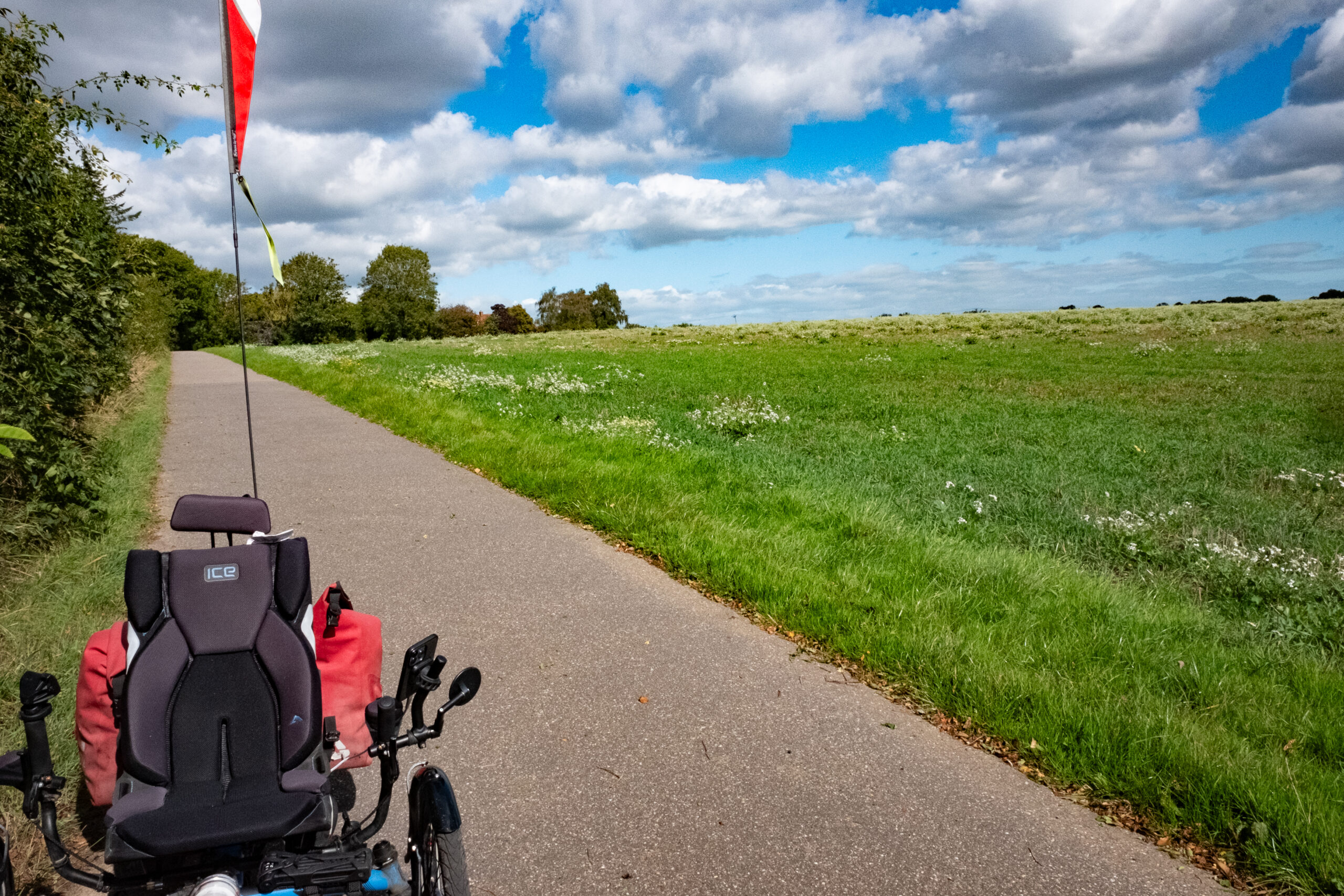 (9) Speaking of flags, we lost one of our bike flags on a very windy day so now John is sporting a tattered, re-purposed white plastic bag on his bike. In truth, it looks like a pair of underpants, as our pal VR noted. We keep popping into various bike shops, and pound-stores, hoping to find something that will work. Nothing yet.