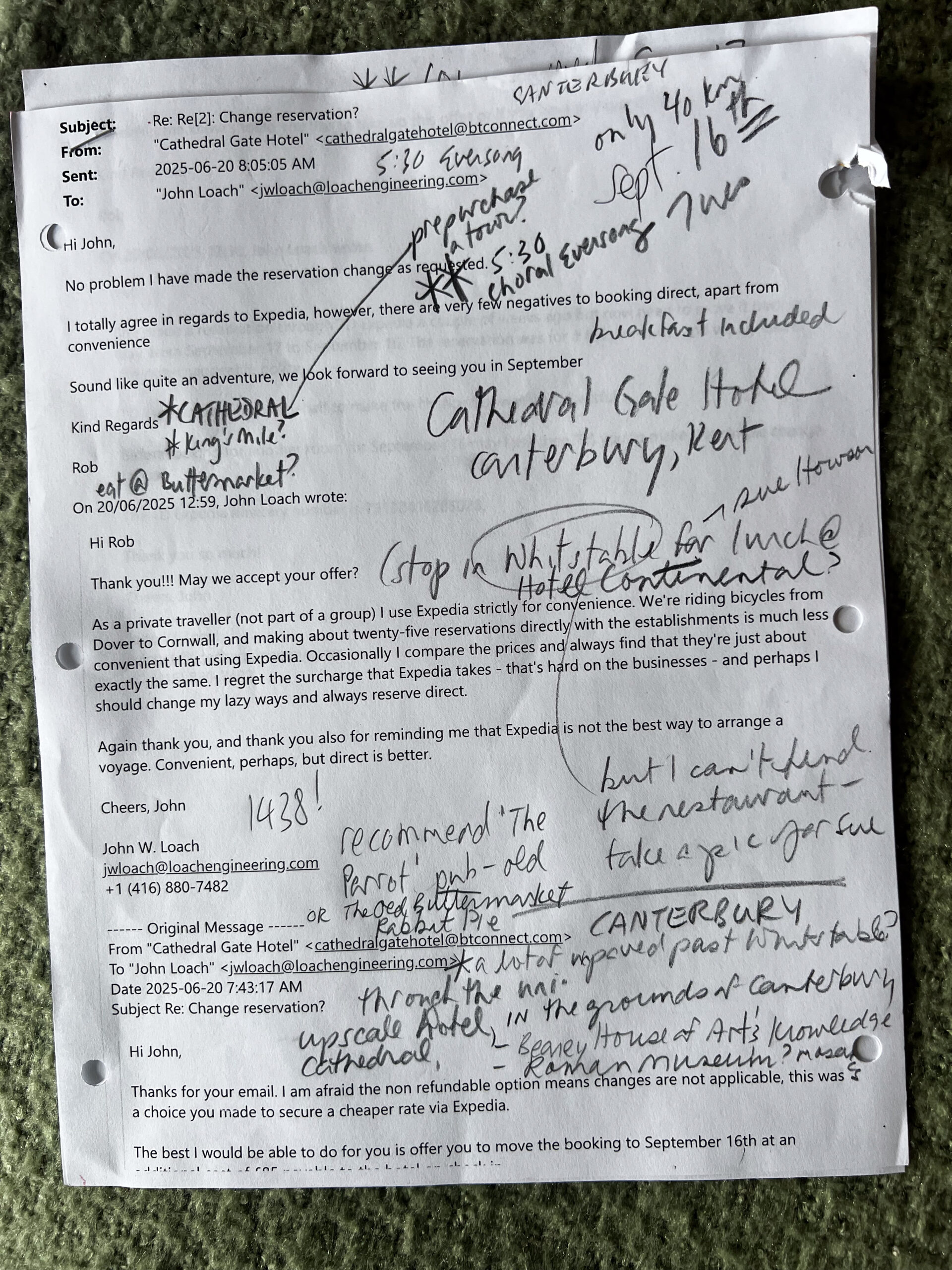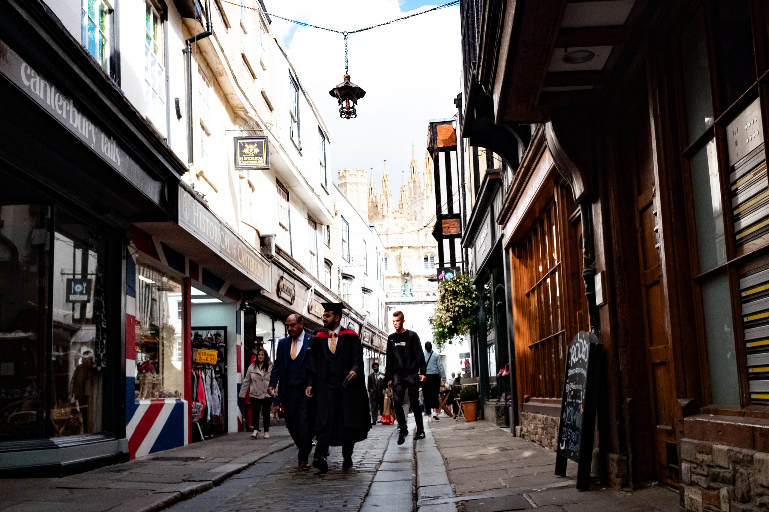 We rode the “Crab and Winkle Way” through the University of Kent’s beautiful campus, and promptly pulled into the hubbub of Canterbury’s centre of town on what was obviously graduation day for one of the colleges. There were black gowns and proud parents and young graduates carrying bouquets everywhere! We found our hotel – the “Cathedral Gate Hotel” – and two strapping young men, family members, carried our folded bikes sideways through an impossibly small hallway into a storage room where they – the bikes – would spend the night. (Better them, than us: John’s back was still a mess from the injury in Gouda.)